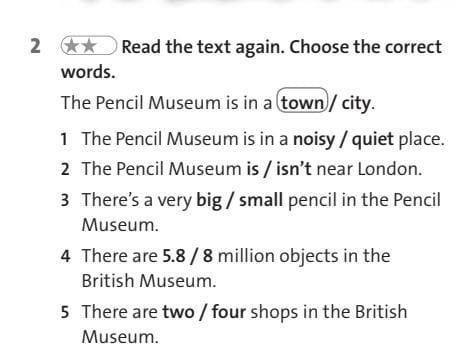 2 ** Read the text again. Choose the correct words. The Pencil Museum is in a town/city. 1 The Pencil Museum is in a noisy / quiet place. 2 The Pencil Museum is / isn't near London. 3 There's a very big / small pencil in the Pencil Museum. 4 There are 5.8 / 8 million objects in the British Museum. 5 There are two / four shops in the British Museum.СРОЧНО