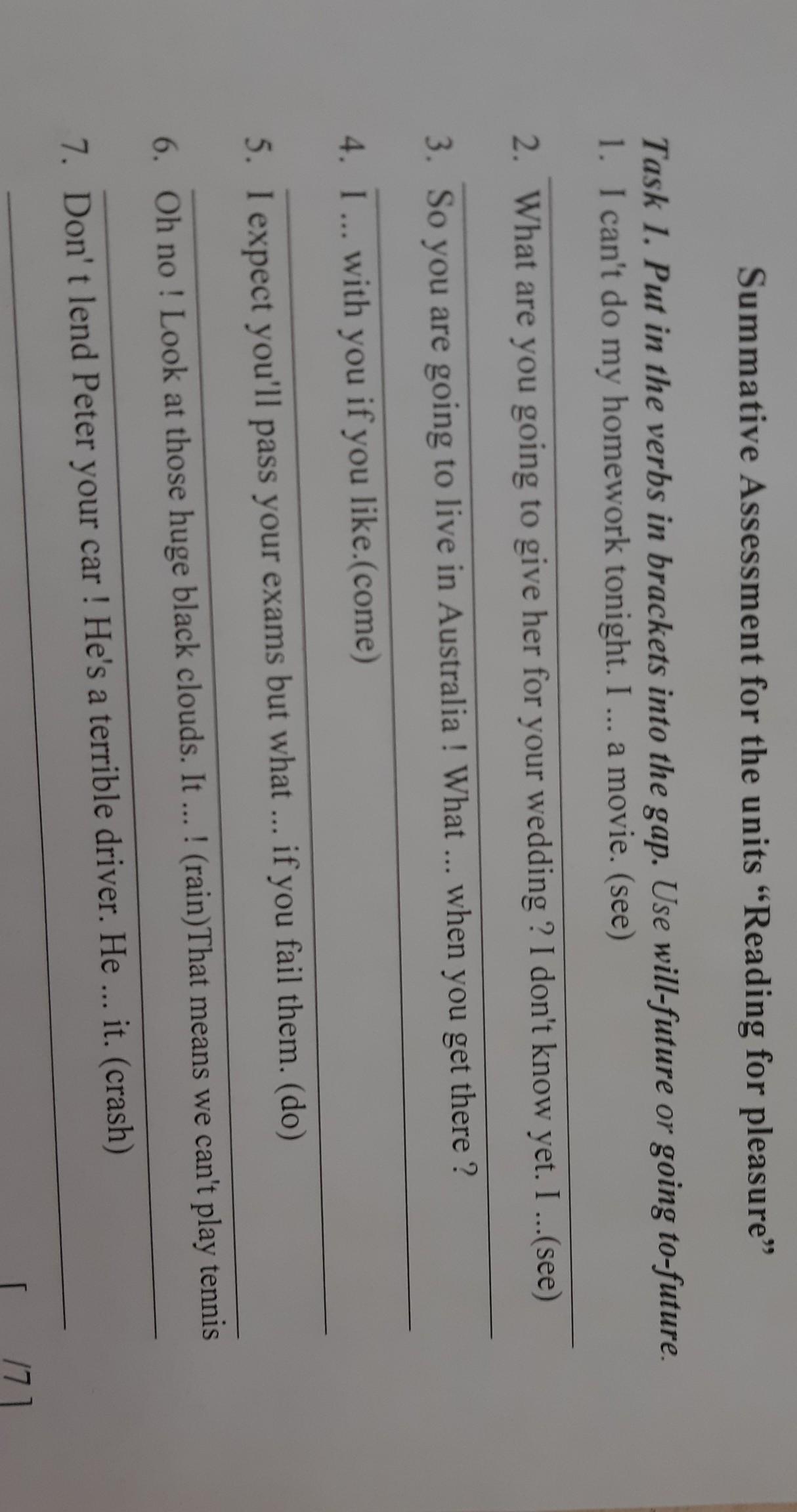 Summative Assessment for the units "Reading for pleasure” Task 1. Put in the verbs in brackets into the gap. Use will-future or going to-future. 1. I can't do my homework tonight. I ... a movie. (see) 2. What are you going to give her for your wedding ? I don't know yet. I ...(see) . 3. So you are going to live in Australia ! What ... when you get there? 4. I ... with you if you like.(come) 5. I expect you'll pass your exams but what ... if you fail them. (do) 6. Oh no! Look at those huge black clouds. It ... ! (rain)That means we can't play tennis 7. Don't lend Peter your car ! He's a terrible driver. He ... it. (crash) помогите пожалуйста пжпжпжпжпжжпжпжпжпэр