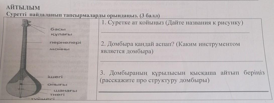 3. Домбыраның құрылысына басы, құлағы, пернелері, мойны, ішегі, ойығы, шанағы, тиегі және түймесі жатады.