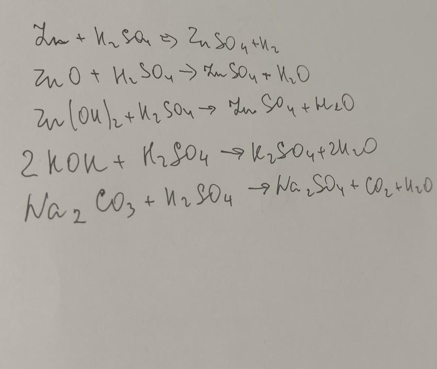 составить уравнения реакций взаимодействия серной кислоты с цинком, оксидом цинка, гидроксидом цинка, гидроксидом калия, карбонатом натрия.