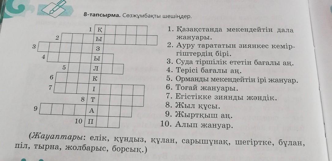 Пожалуйста 8-тапсырма. Сөзжұмбақты шешіңдер. 1. Қазақстанда мекендейтін дала 1| Қ жануары. Ы 2. Ауру тарататын зиянкес кемір- 3 гіштердің бірі. Ы 3. Суда тіршілік ететін бағалы аң. Л 4. Терісі бағалы аң. 5. Орманды мекендейтін ірі жануар. K 6. Тоғай жануары. I 7. Егістікке зиянды жәндік. 8 IT 8. Жыл құсы. A 9. Жыртқыш аң. 10 | П 10. Алып жануар. 6 7 9 (Жауаптары: елік, құндыз, құлан, сарышұнақ, шегіртке, бұлан, піл, тырна, жолбарыс, борсық.)