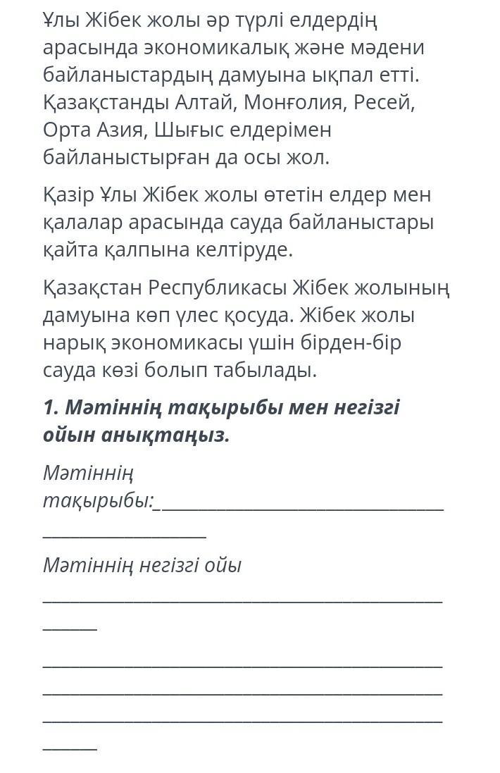 Мәтіннің негізгі ойы:Бұл мәтінде Ұлы жібек жолының дамуы және жібек жолының экономикалық мәдени байланыстар туралы ойы бар деп ойлаймын.