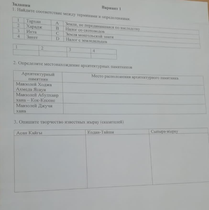 Варна Задания 1. Найдите соответствие между терминами и определениями. 1 2 3 Тархан Харади Икта Закет B С D Земля, не передававшаяся по наследств Налю со скотоводов Земля монгольской знати Налог с земледельцев 2 3 тектурных памятников