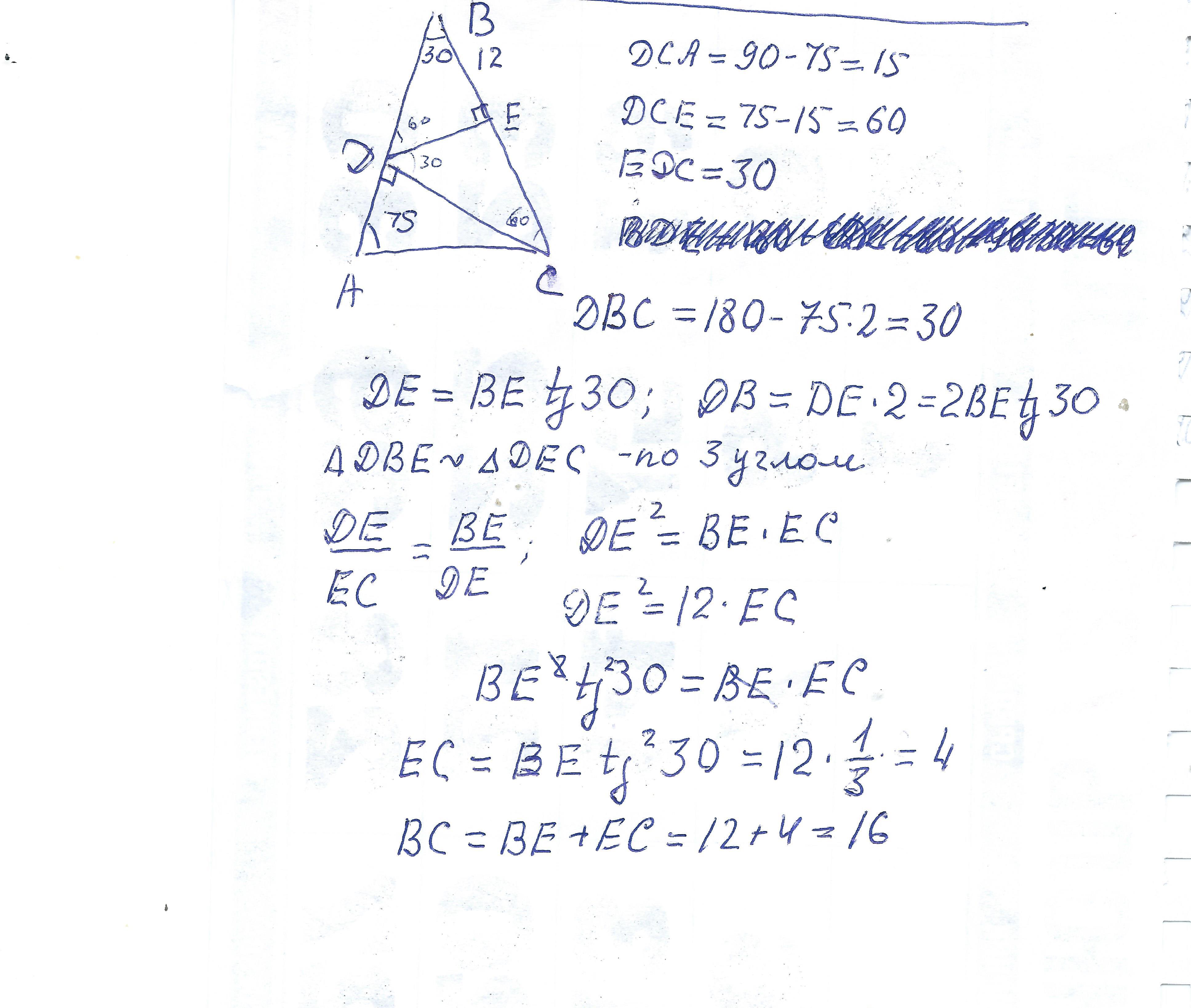 В равнобедренном треугольнике ABC с основанием AC угол A составляет 75°, из угла C построен перпендикуляр CD к противолежащей стороне, точка D лежит на стороне AB. Из точки D построен перпендикуляр DE к стороне BC, точка E лежит на стороне BC. Известно, что отрезок BE равен 12 см.