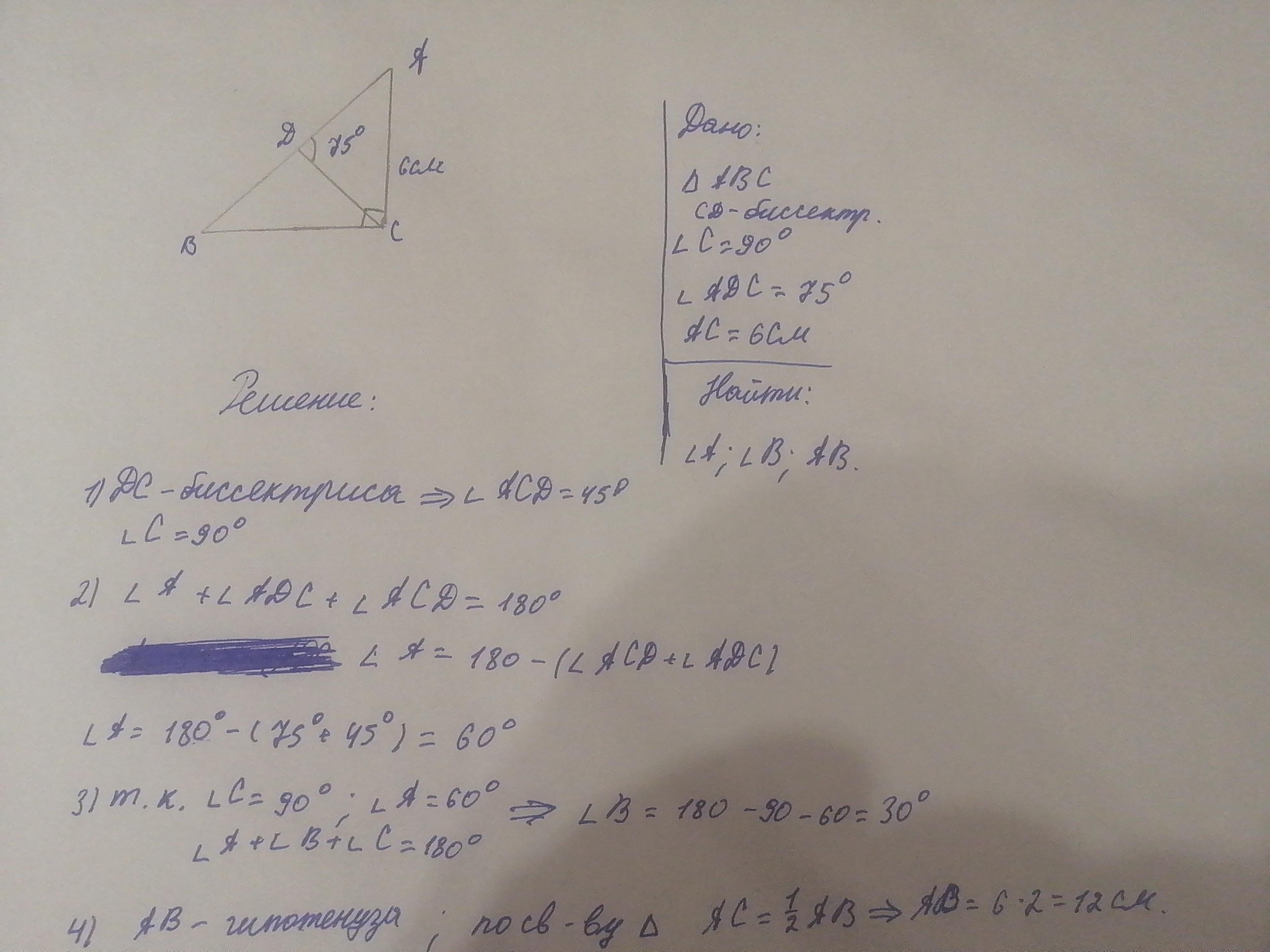 1. В прямоугольном треугольнике ABC угол C=90° проведена биссектриса CD. Угол ADC=75° и сторона АС=6 см. Найдите углы А и В, длину отрезка АВ.