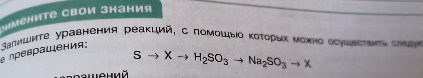 Запишите уравнения реакций, с помощью которых можно осуществить следующие превращения: S --> X --> H2SO3 --> Na2SO3 --> X