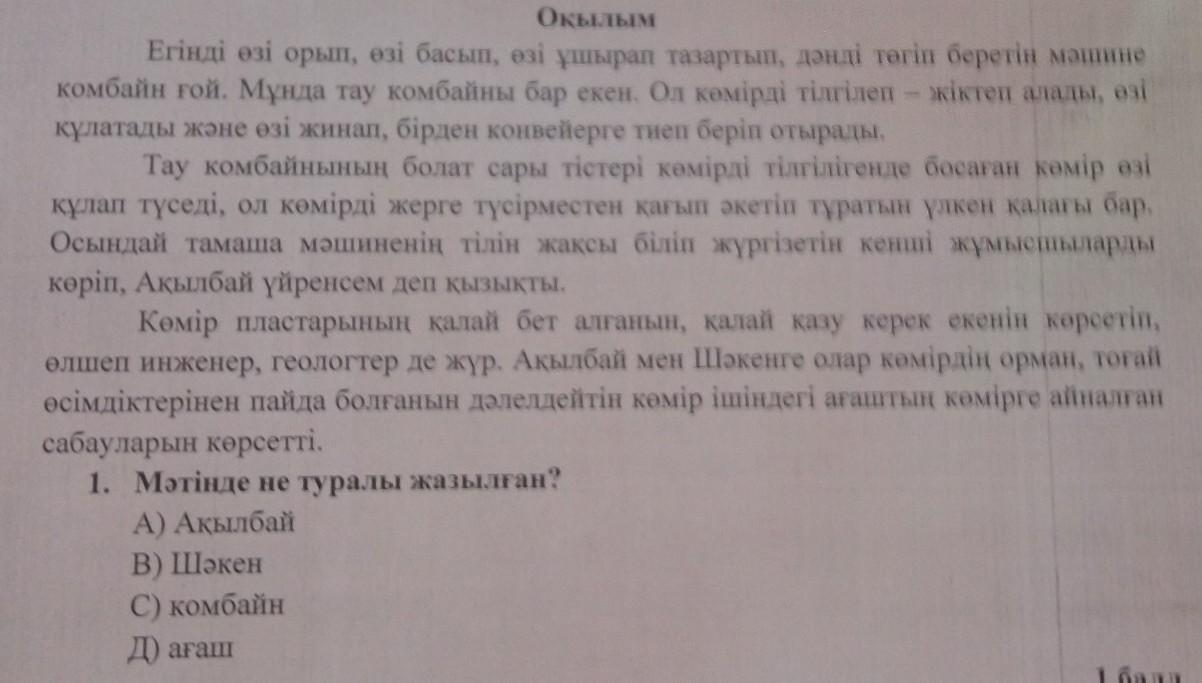 1. Мәтiнде не туралы жазылған? А) Акылбай В) Шәкен С) комбайн Д) ағаш