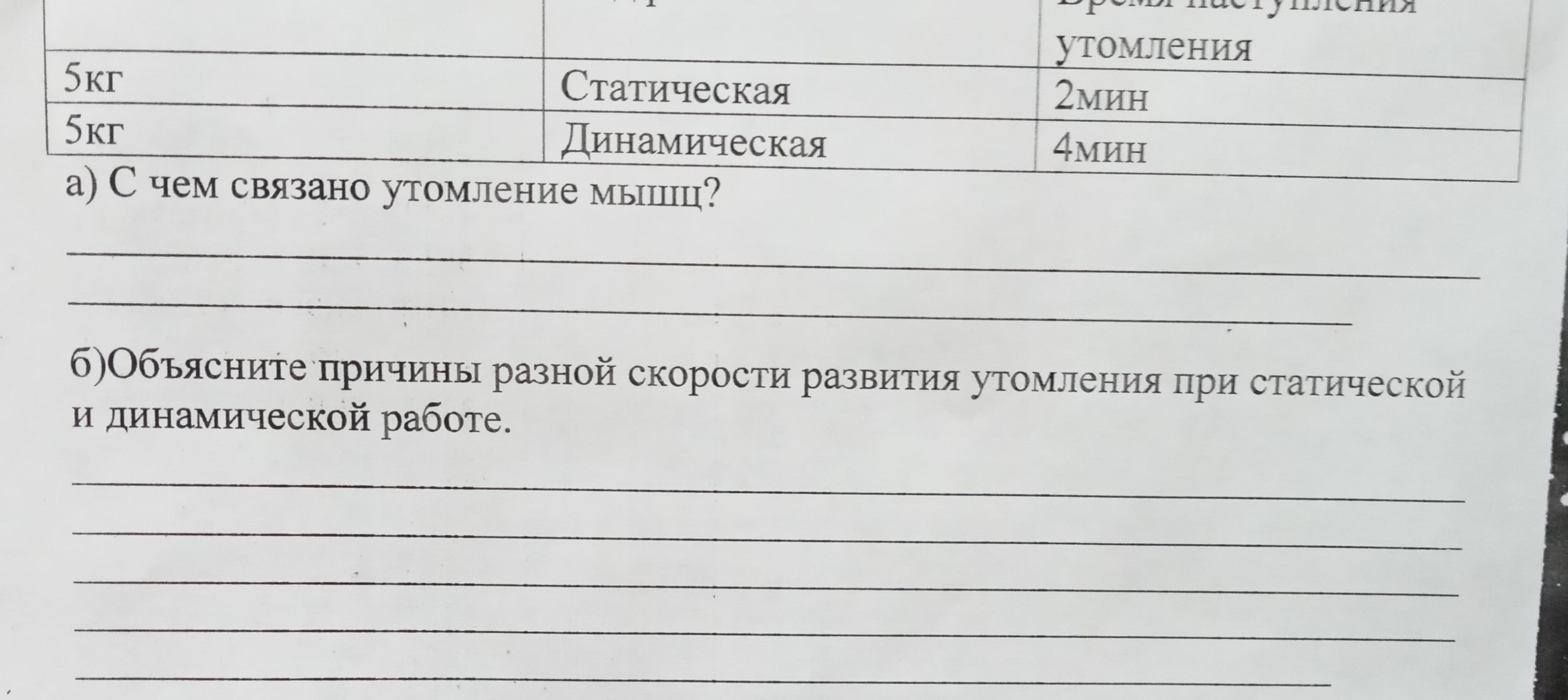 ПОМОГИТЕ СОР ПО БИОЛОГИИ ЗА 9 КЛАСС, ДАЮ 100 БАЛЛОВ Исследуя процесс утомления мышц при статической и динамической работы, учащиеся удерживали гантелю в удобном для них ритме. И в том, и в другом случае они замеряли время до утомления. Данные эксперимента представлены в таблице.