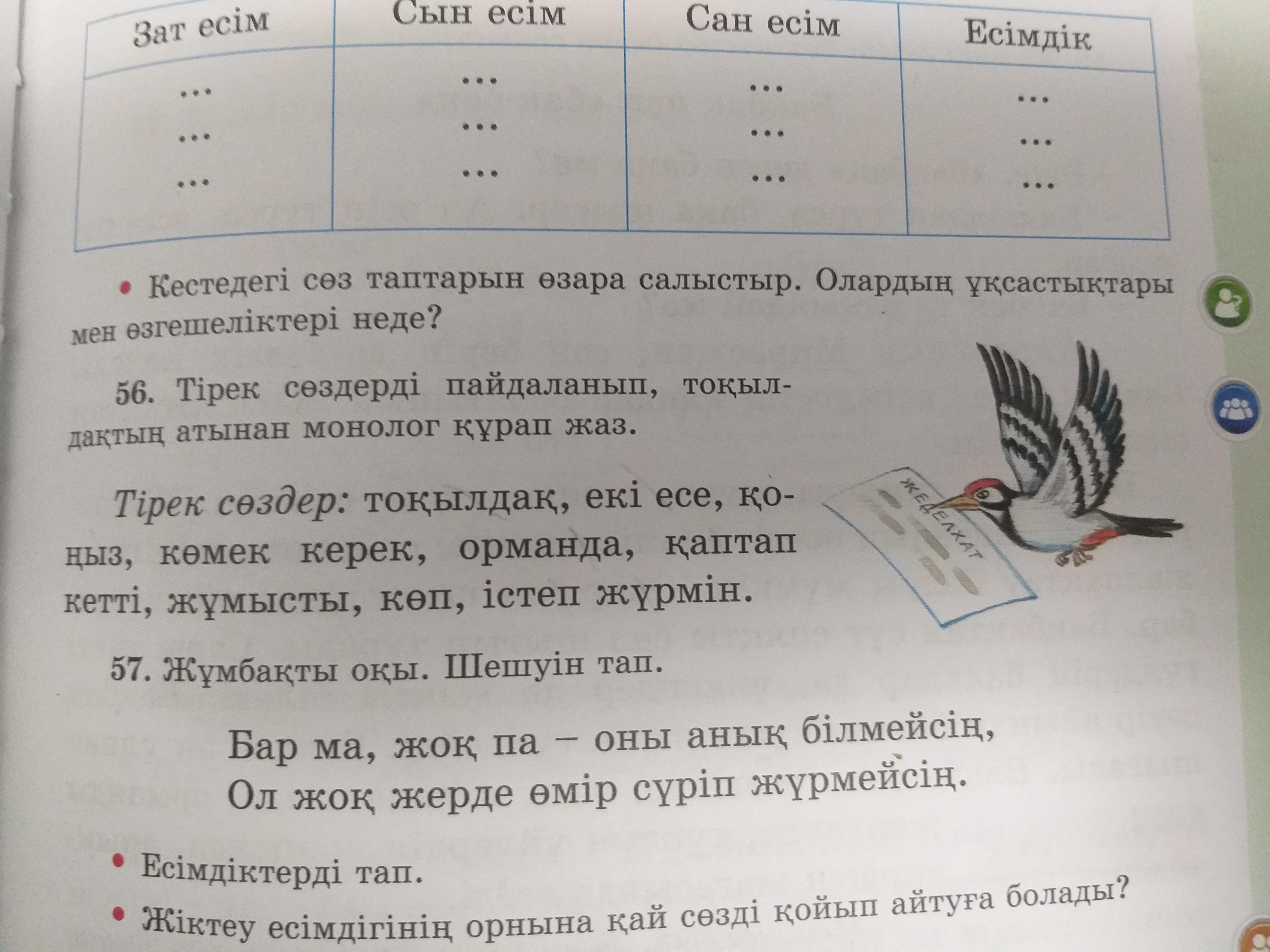 Менің атым тоқылдақ. Мен басқа құстарға қарағанда өте пайдалымын.Мен қоңыздармен қоректенемін.Орманда көмек керек болса мен әрқашан дайынмын.Қазір мен хат тасумен айналысамын.Жұмысым өзіме қатты ұнайды.Наурыз мейрамына байланысты хаттар