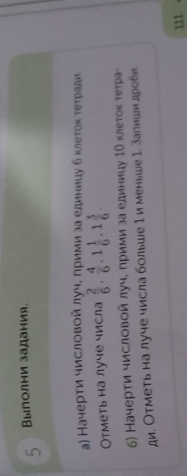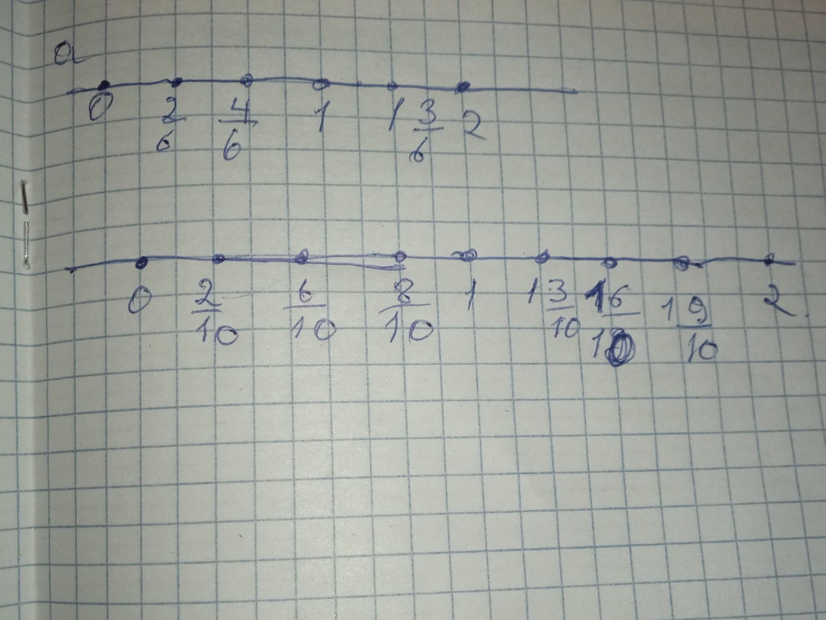 а) Начерти числовой луч, прими за единицу 6 клеток тетради. 2. Отметь на луче числа 2/6, 4/6, 1 1/6, 1 3/6. б) Начерти числовой луч, прими за единицу 10 клеток тетра- ди. Отметь на луче числа больше 1 и меньше 1. Запиши дроби.