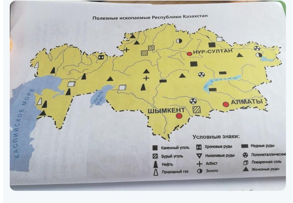 и утольные месторождения Изобрази на карте Отметь нефтяные, газовые на контурной карте Казахстана. Условные обозначення утоль нефть Д Напиши вывод Уголь в Казахстане добывается в месторождениях Нефть имеется на территориях областей Запасы газа имеются