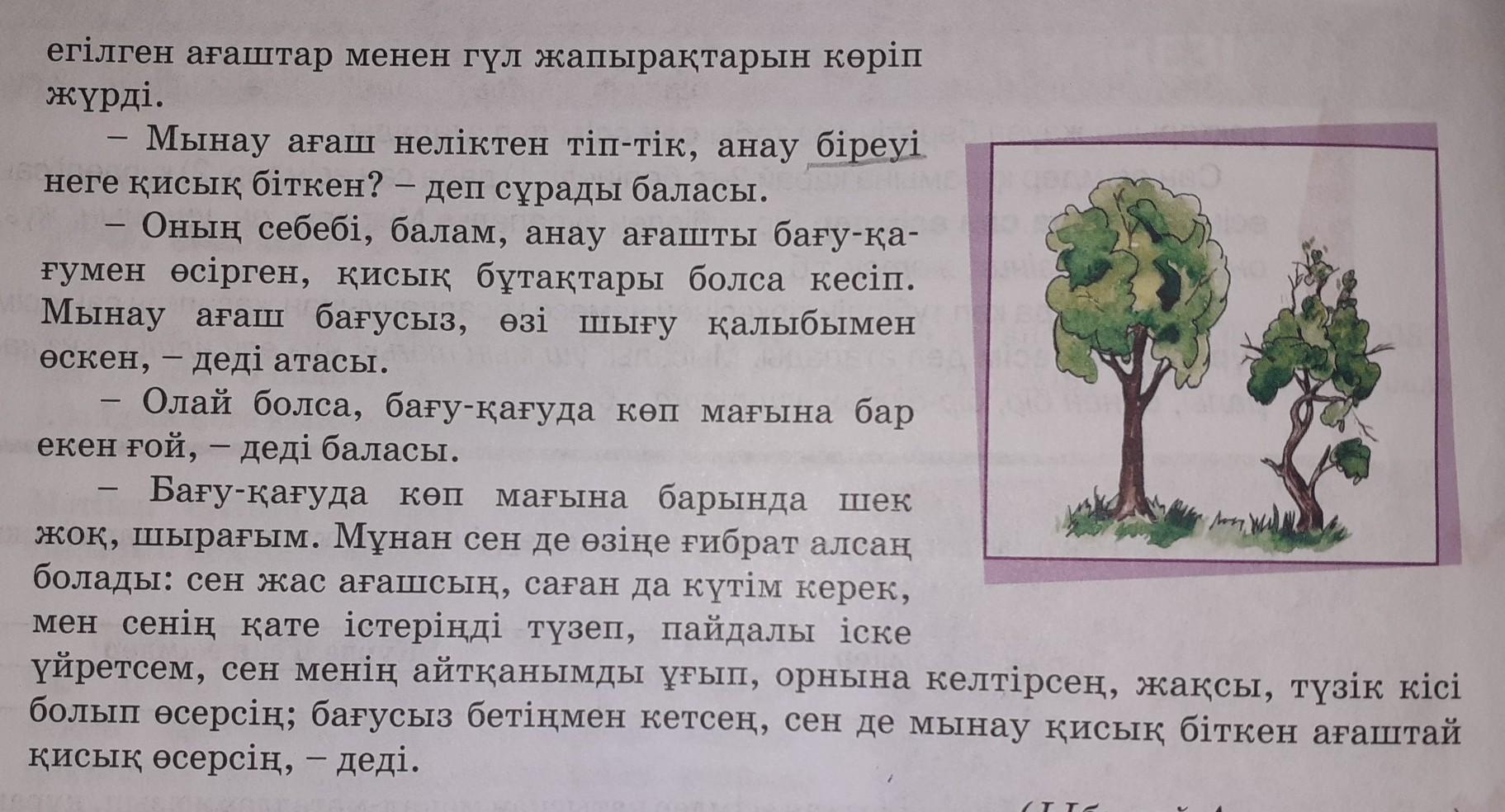 Мені бағым-қағып өсірсе, мұғалім, отбасымды және т.б.ларды тындасам, не айтқаның істесем мен түзу ағаш боламын. Ал егер бәрін тындамай, ата-анамсыз өссем, жаман қылықтвр істесем мен қыйсық ағаш баламын.