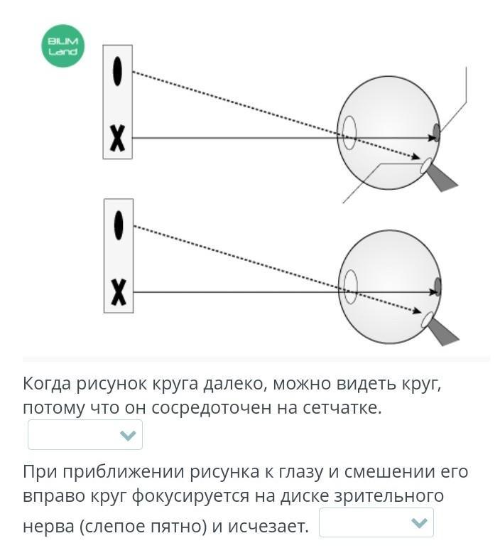 Структура и функции палочек и колбочек, волосковых клеток. Лабораторная работа «Определение слепого пятна, опыт со смешением цветов, воздушной и костной проводимости» При проведении лабораторной работы по обнаружению слепого пятна учащийся сделал выводы, показывающие, почему глаза видят и не видят круг на определенном расстоянии. Соотнеси, какой из рисунков соответствует каждому выводу.