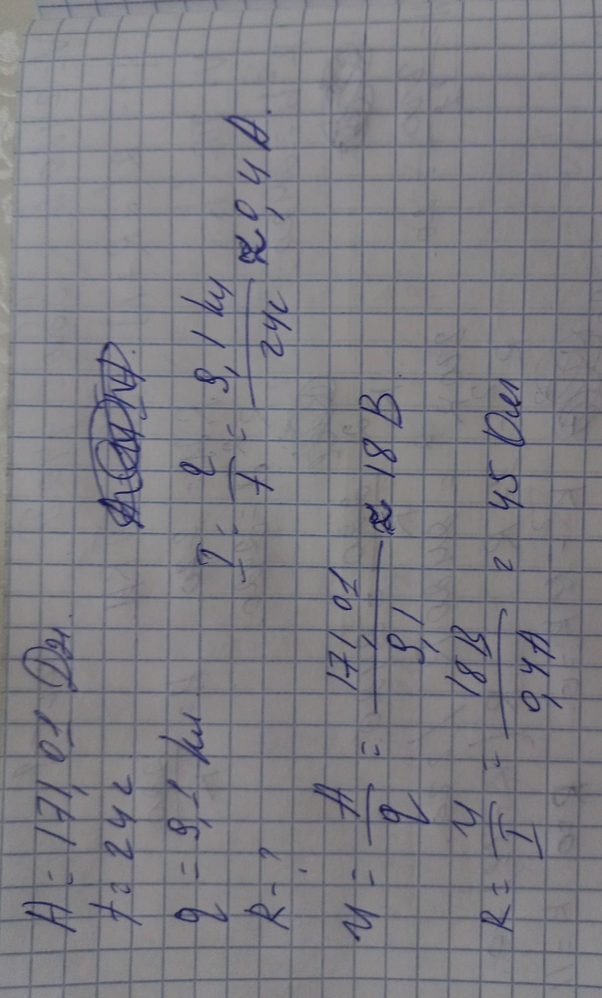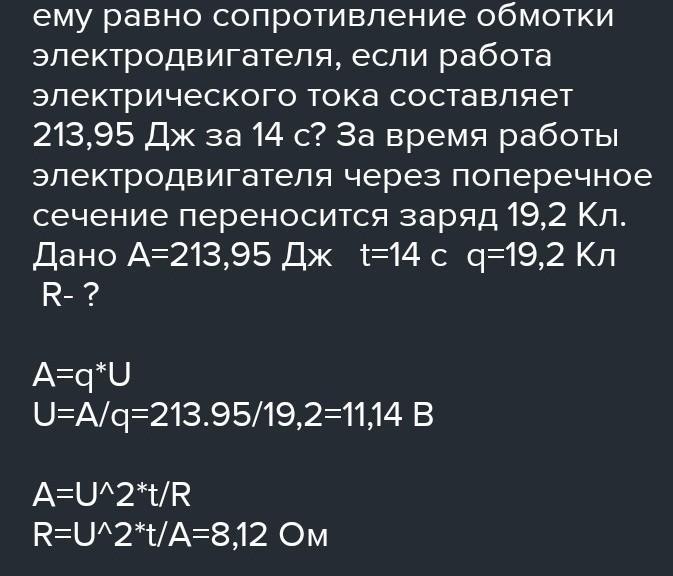 Чему равно сопротивление обмотки электродвигателя, если работа электрического тока составляет 171,01 Дж за 24 с? За время работы электродвигателя через поперечное сечение переносится заряд 9,1 Кл.
