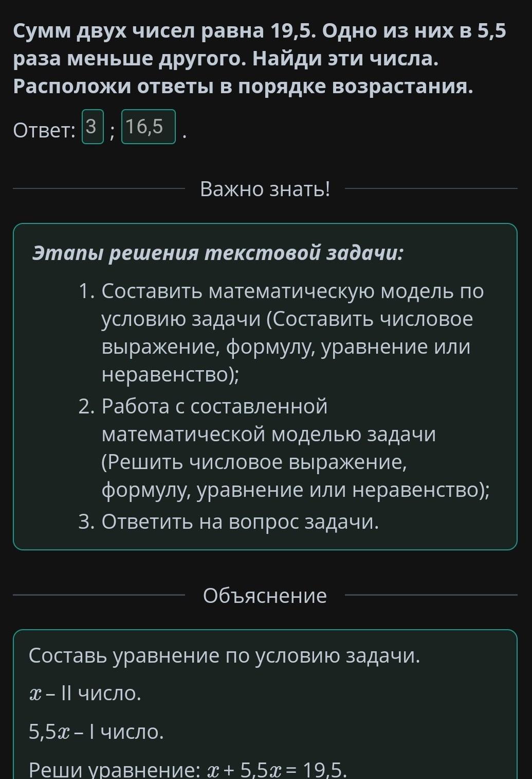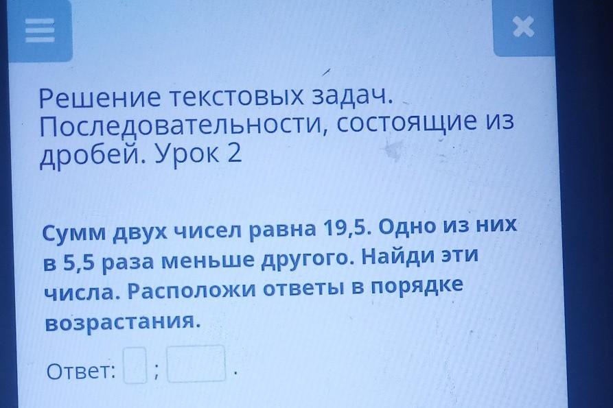 Решение текстовых задач. Последовательности, состоящие из дробей. Урок 2 Сумм двух чисел равна 19,5. Одно из них в 5,5 раза меньше другого. Найди эти числа. Расположи ответы в порядке возрастания. Ответ: ; .