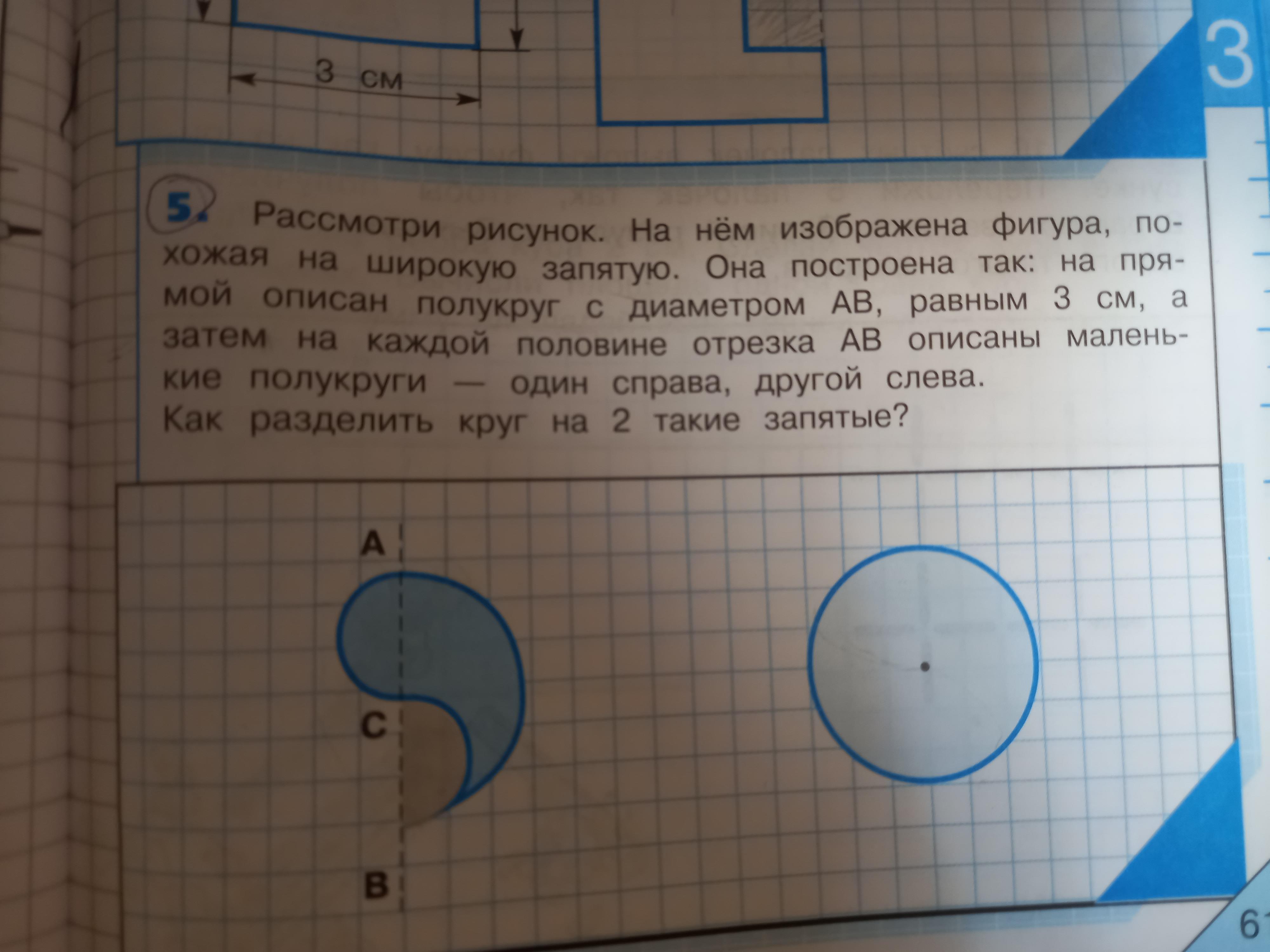 Рассмотри рисунок. На нём изображена фигура, похожая на широкую запятую. Она построена так: на прямой описан полукруг с диаметром AB, равным 3 см, а затем на каждой половине отрезка АB описаны маленькик полукруги- один справа, другой слева. как Разделить круг на 2 такие запятые?