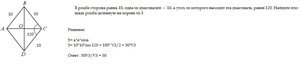 ПОЖАЛУЙСТА ПОМОГИТЕ!!!!!!В ромбе сторона равна 10, одна из диагоналей — 10, а угол, из которого выходит эта диагональ, равен 120. Найдите площадь ромба деленную на корень из 3