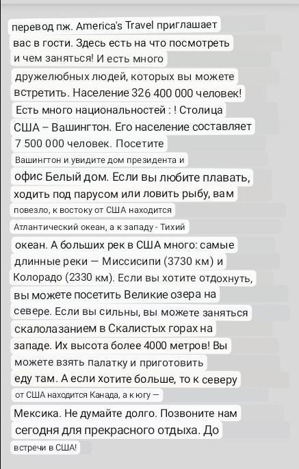 перевод пж . America's Travel invites you to visit the There is a lot you can do and see! And there are a lot of friendly people you can meet. The population is 326,400,000 people! There are many nationalities : ! The capital of the USA is Washington. Its population is 7,500,000 people. Visit Washington and see the President's home and office the White House the If you like swimming, sailing or fishing, you are lucky, To the east of the USA is the Atlantic Ocean and to the west is the Pacific Ocean. And there are many big rivers in the USA: the longest rivers are the Mississippi (3,730 km) and the Colorado (2,330 km). If you want to have a rest, you can visit the Great Lakes in the north. If you are strong, you can go climbing in the Rocky Mountains in the west. They are more than 4,000 metres high! You can take a tent and cook your meals there. And if you want more, to the north of the USA is Canada and to the south is Mexico. Don't think long. Phone us today for a wonderful holiday. See you in the USA!