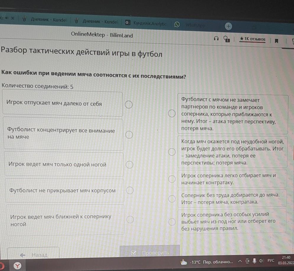 Разбор тактических действий игры в футбол Как ошибки при ведении мяча соотносятся с их последствиями? Количество соединений: 5 Игрок отпускает мяч далеко от себя Футболист с мячом не замечает партнеров по команде и игроков соперника, которые приближаются к нему. Итог – атака теряет перспективу, потеря мяча. Футболист концентрирует все внимание на Мяче Когда мяч окажется под неудобной ногой, игрок будет долго его обрабатывать. Итог — замедление атаки, потеря ее перспективы; потеря мяча. Игрок ведет мяч только одной ногой Игрок соперника легко отбирает мяч и начинает контратаку. Футболист не прикрывает мяч корпусом Соперник без труда добирается до мяча. Итог – потеря мяча, Контратака. Игрок ведет мяч ближней к сопернику ногой Игрок соперника без особых усилий выбьет мяч из-под ног или отберет его без нарушения правил.
