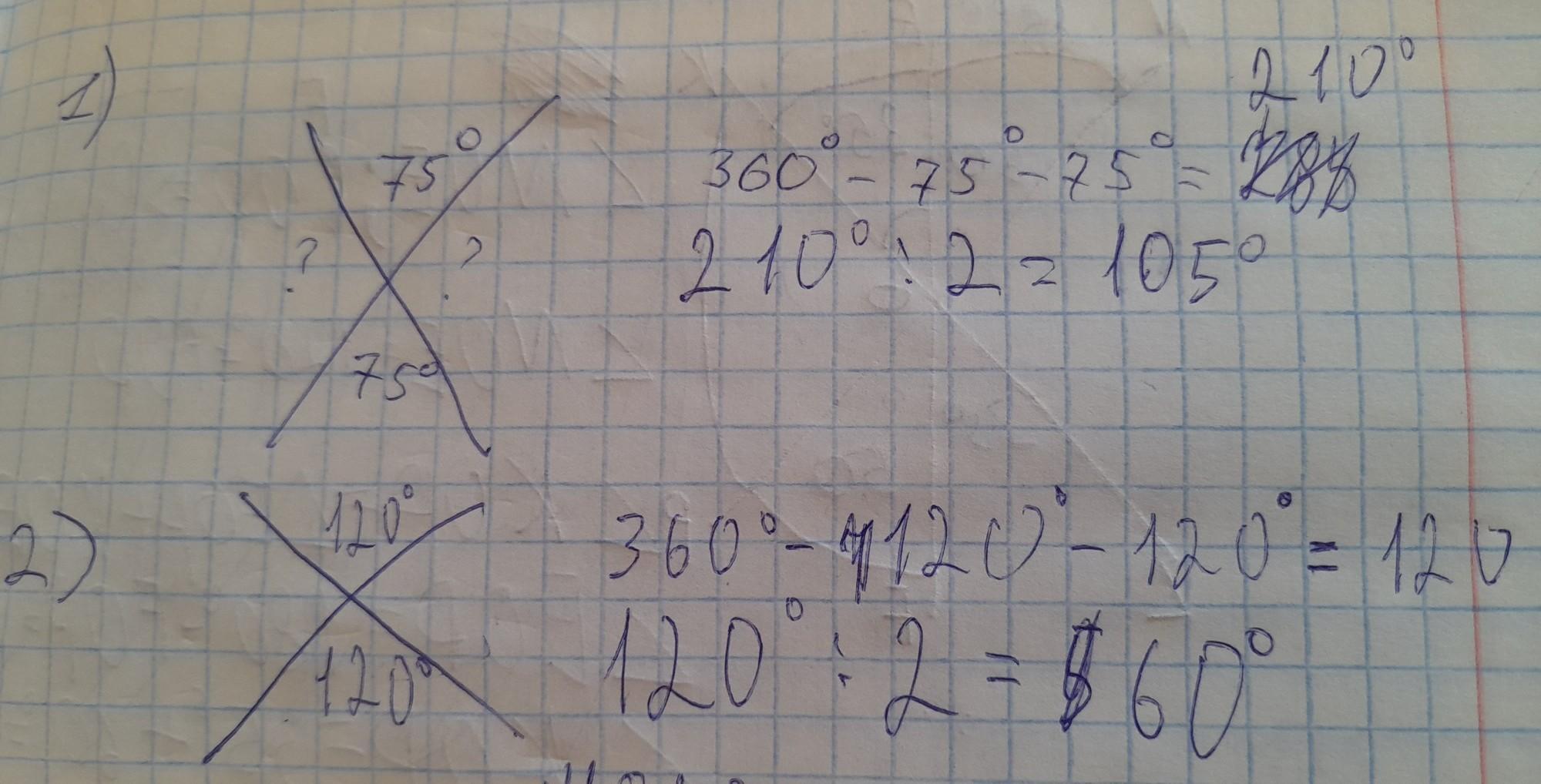 При пересечении двух прямых один из полученных углов Равен 1) 75; 2) 120. Найдите градусные меры остальных углов