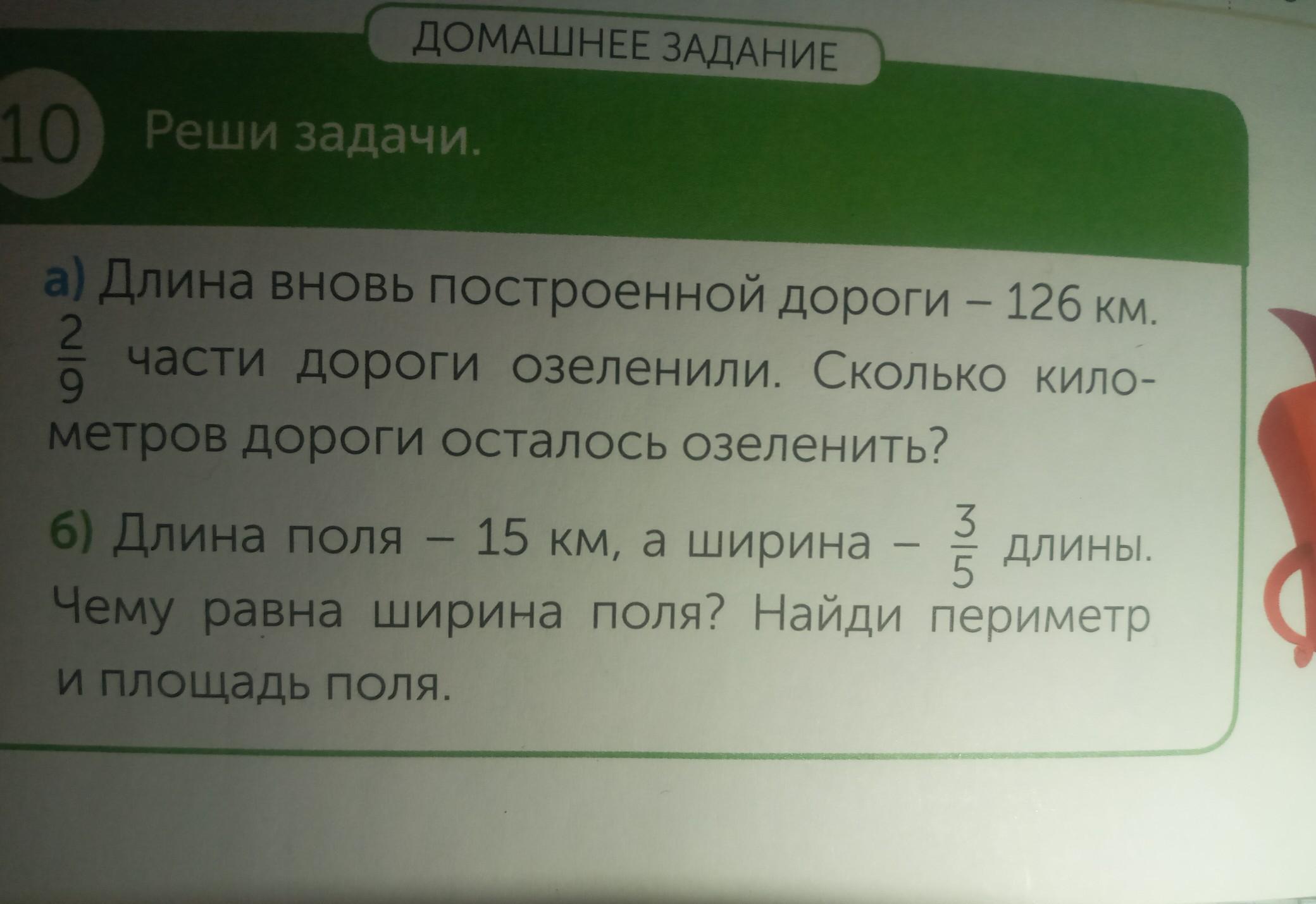 10 Реши задачи а) Длина вновь построенной дороги - 126 км части дороги озеленили. Сколько кило метров дороги осталось озеленить? 6) Длина поля - 15 км, а ширина 2 длины Чему равна ширина поля? Найди периметр и площадь поля 8