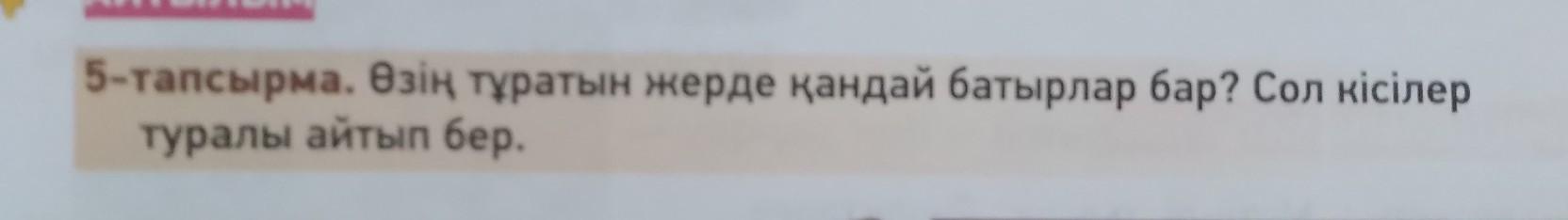5-тапсырма. Өзің тұратын жерде қандай батырлар бар? Сол кісілер туралы айтып бер. Мен Атырауда тұрамын.