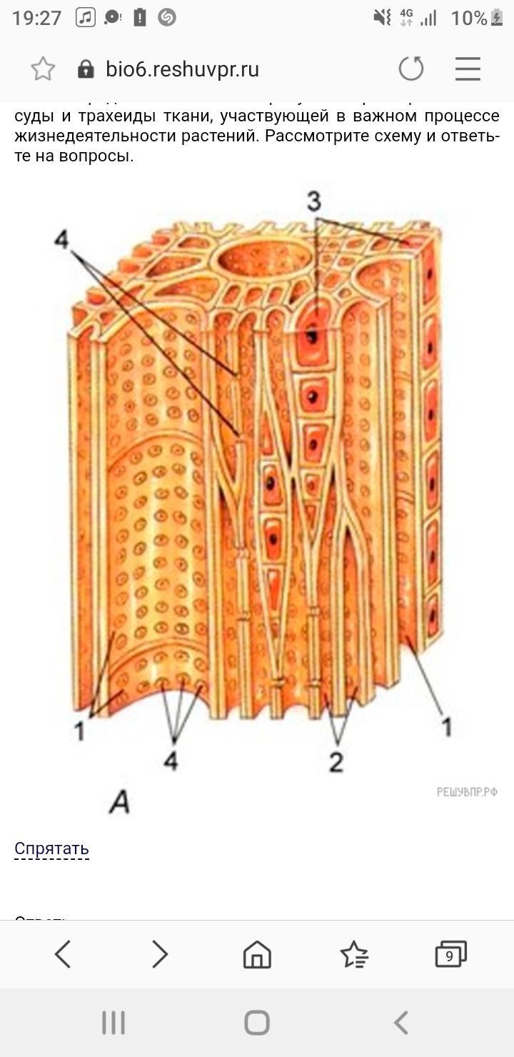 На представленном ниже рисунке зафиксированы сосуды и трахеиды ткани, участвующей в важном процессе жизнедеятельности растений. Рассмотрите схему и ответьте на вопросы.
