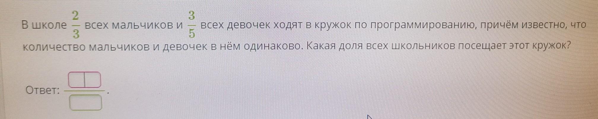 2 3 В школе всех мальчиков и всех девочек ходят в кружок по программированию, причём известно, что 3 5 Количество мальчиков и девочек в нём одинаково, Какая доля всех школьников посещает этот кружок?