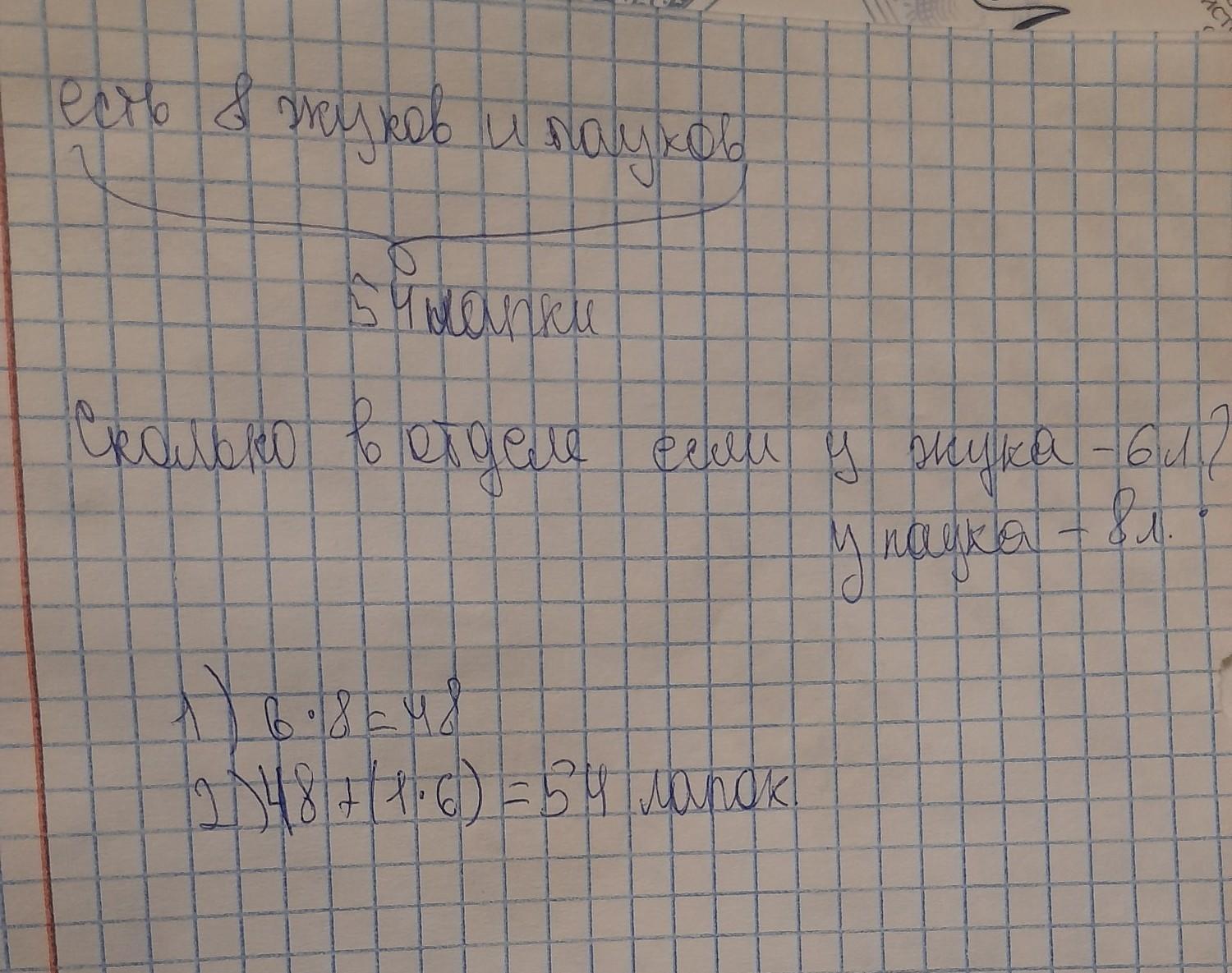 В отделе насекомых (инсерктарии) зоопарка есть 8 жуков и пауков, всего у них 54 лапы. Сколько в отделе тех и других, если у жука 6 лап, у паука-8