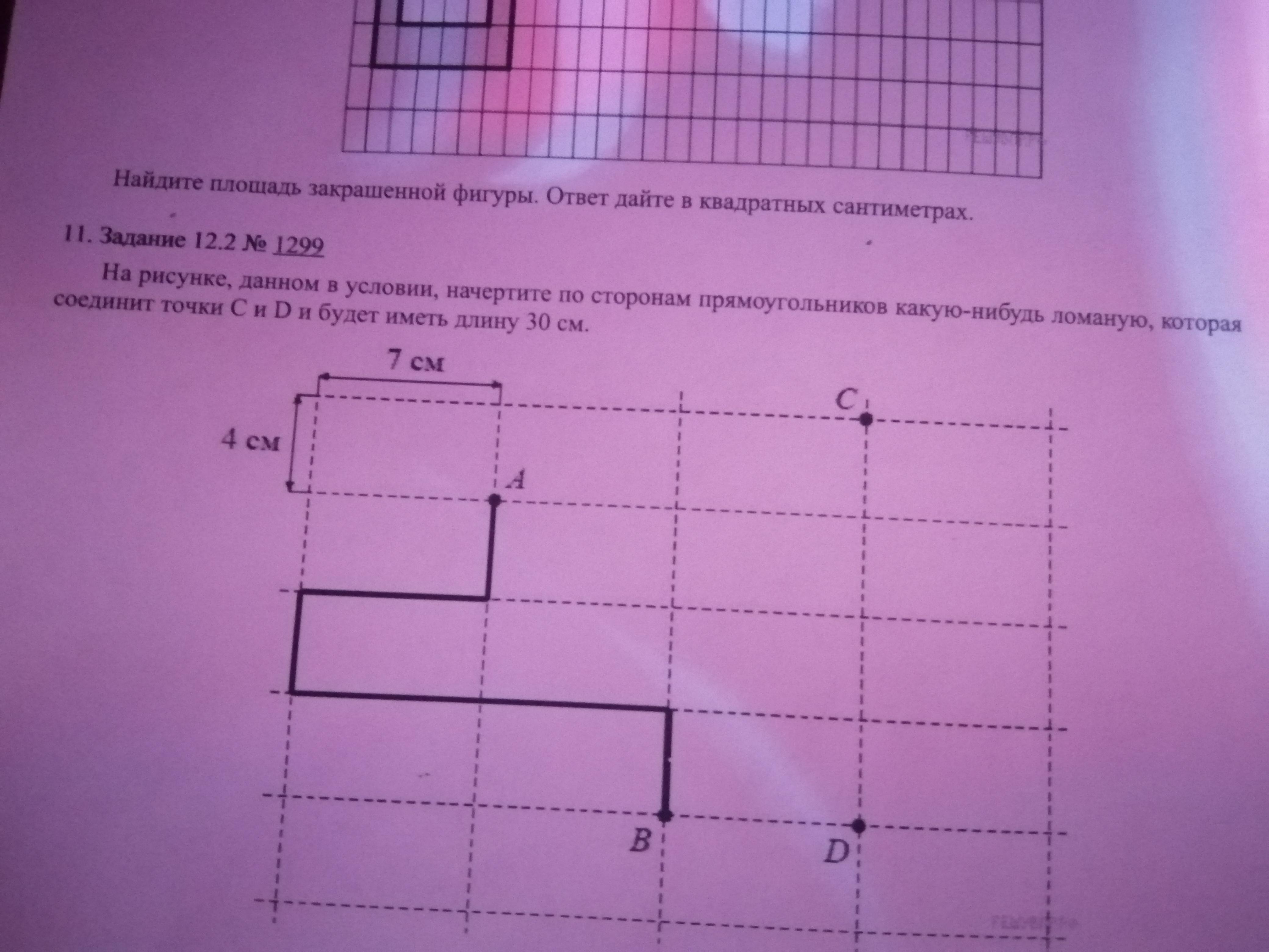 От точки С вправо (7 см), вниз (4 см), влево (7 см), вниз 3 раза (4 см · 3) до точки D.