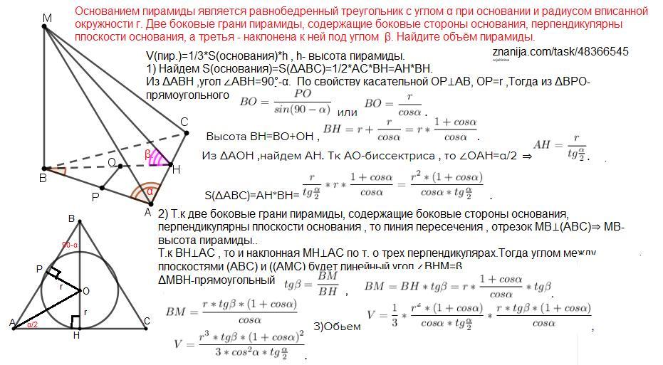 Основанием пирамиды является равнобедренный треугольник с углом а при основании и радиусом вписанной окружности г. Две бо ковые грани пирамиды, содержащие боковые стороны основания перпендикулярны плоскости основания, а третья - наклонена к ней под углом В. Найдите объём пирамиды.