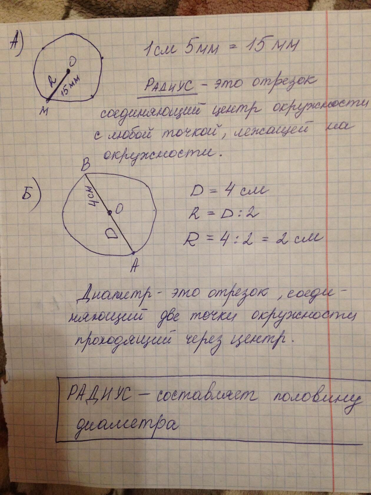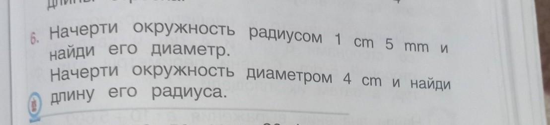 6. Начерти окружность радиусом 1 cm 5 mm и найди его диаметр. Начерти окружность диаметром 4 cm и найди Ф) длину его радиуса.