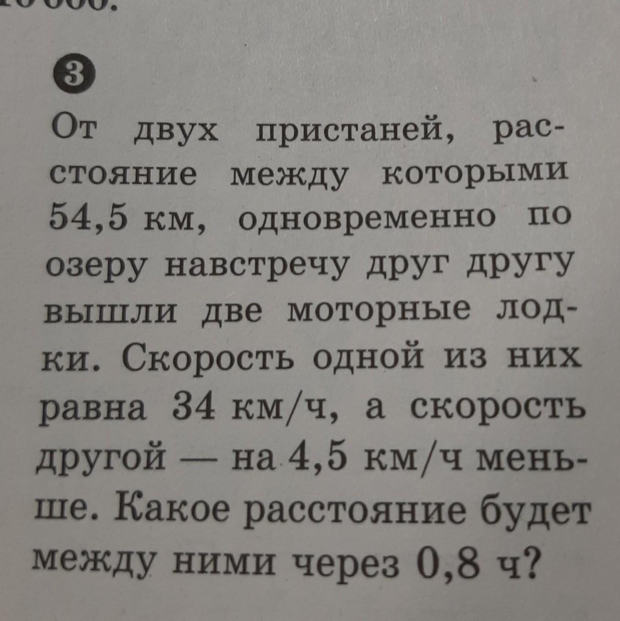 От двух пристаней, расстояние между которыми 54,5 км, одновременно по озеру вышли две моторные лодки. Скорость одной из них равна 34км/ч, а скорость другой на 4,5 км/ч меньше. Какое расстояние будет между ними через 0,8ч?