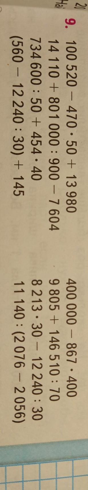 Мин. 9. 100 520 - 470. 50 + 13 980 14 110 + 801 000 : 900 - 7604 734 600 : 50 + 454.40 (560 - 12 240 : 30) + 145 400 000 - 867 - 400 9 805 + 146 510 : 70 8 213.30 - 12 240 = 30 11 140: (2076 - 2056) помогите с действиями прошу