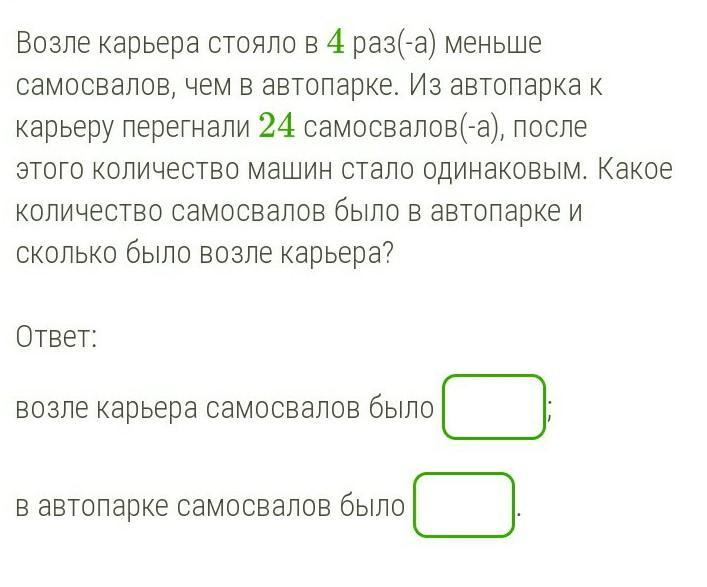 возле карьера стояло в 4 раза меньше самосвалов чем в автопарке из автопарка к карьеру перегнали 24 самосвалов после этого количество машин стало одинаковым