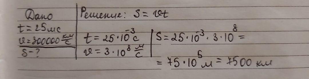 Как далеко находится космический корабль от Земли если радиосигнал идет 25 мс? Скорость распространения волн 300.000 км/с