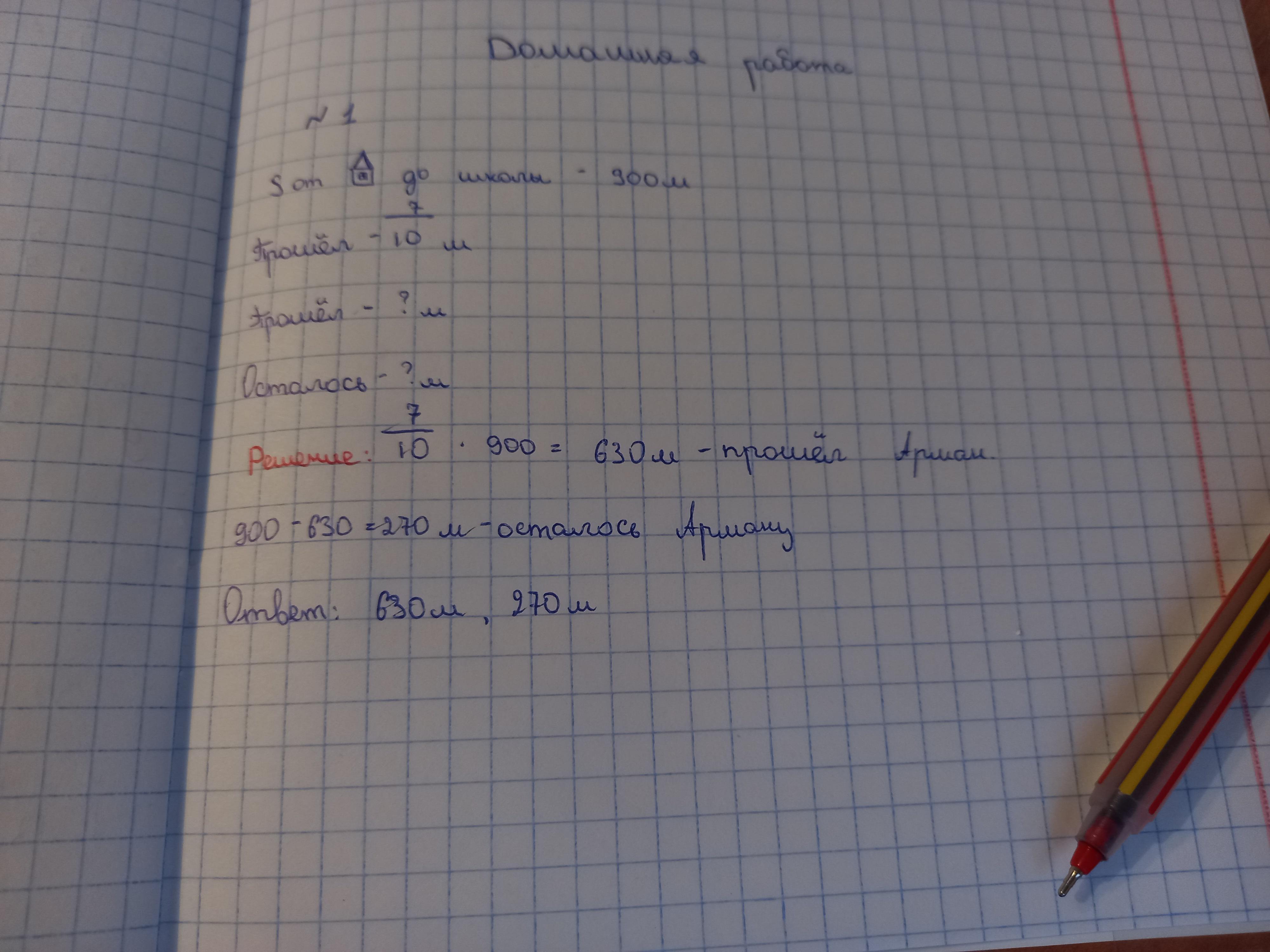 Расстояние по прямой дороги от дома до школы 900 м. Арман прошел 7/10 этого расстояния. Сколько метров прошел Арман? И сколько метров осталось пройти Арману