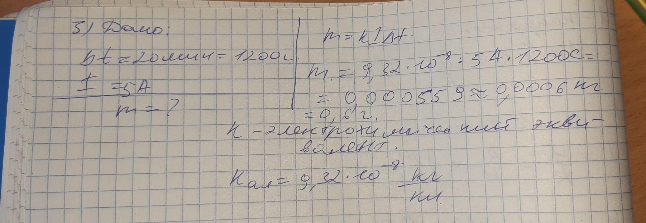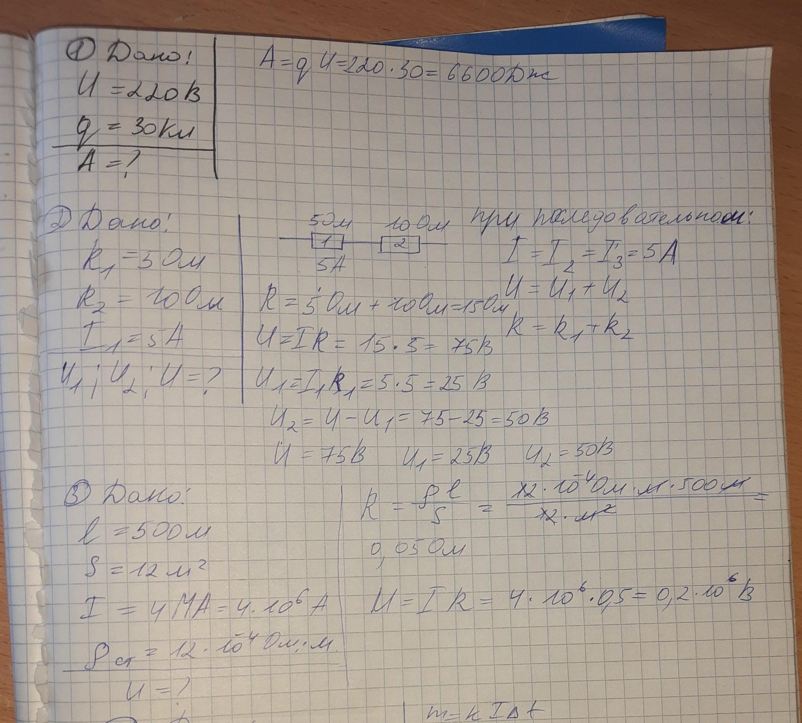 Через сечение провода лампы при напряжении 220 В прошел заряд 30 Кл. Расчитать работу электрического поля. (26) No2 Схема состоит из двух последовательно соединенных резисторов сопротивлениями 5 Ом и 10 Ом. Ток первого резистора 5 А. Найдите напряжение каждого резистора и общее напряжение. (36) No3 Чему равно напряжение телеграфа длиной 500 ми сечением 12 м2 при токе 4 МА? (р стали = 12-10-4 Ом*м) (46) No4 Электродвигатель крана подключен к сети 500 В. Ток в обмотке в это время равен А. Какова производительность крана, если он поднимает груз массой 1000 кг на высоту 50 м за 5 мин? (56) м No5 Сколько алюминия выделится при электролизе за 20 мин, если сила тока 5 А? (3б