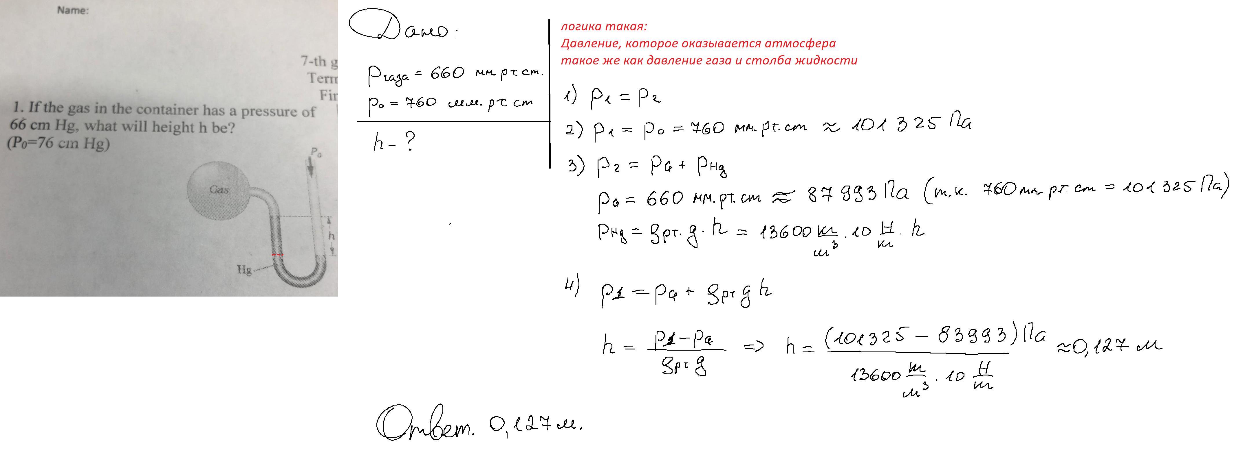 Логика простая: давление атмосферы уравновешивается с давлением газа внутри сосуда и давлением столба ртути)