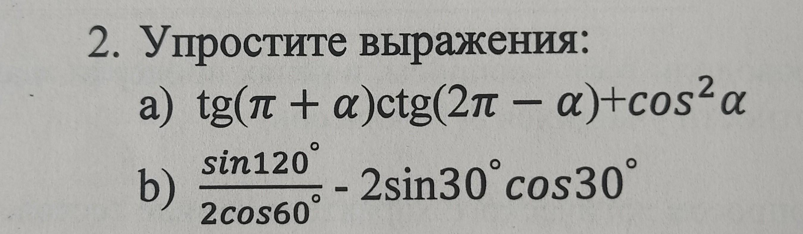 а) tg(π+α)*ctg(2π-α)+cos²α=tgα*(ctg(-α))+cos²α=-tgα*(ctgα)+cos²α=-(1-cos²α)=