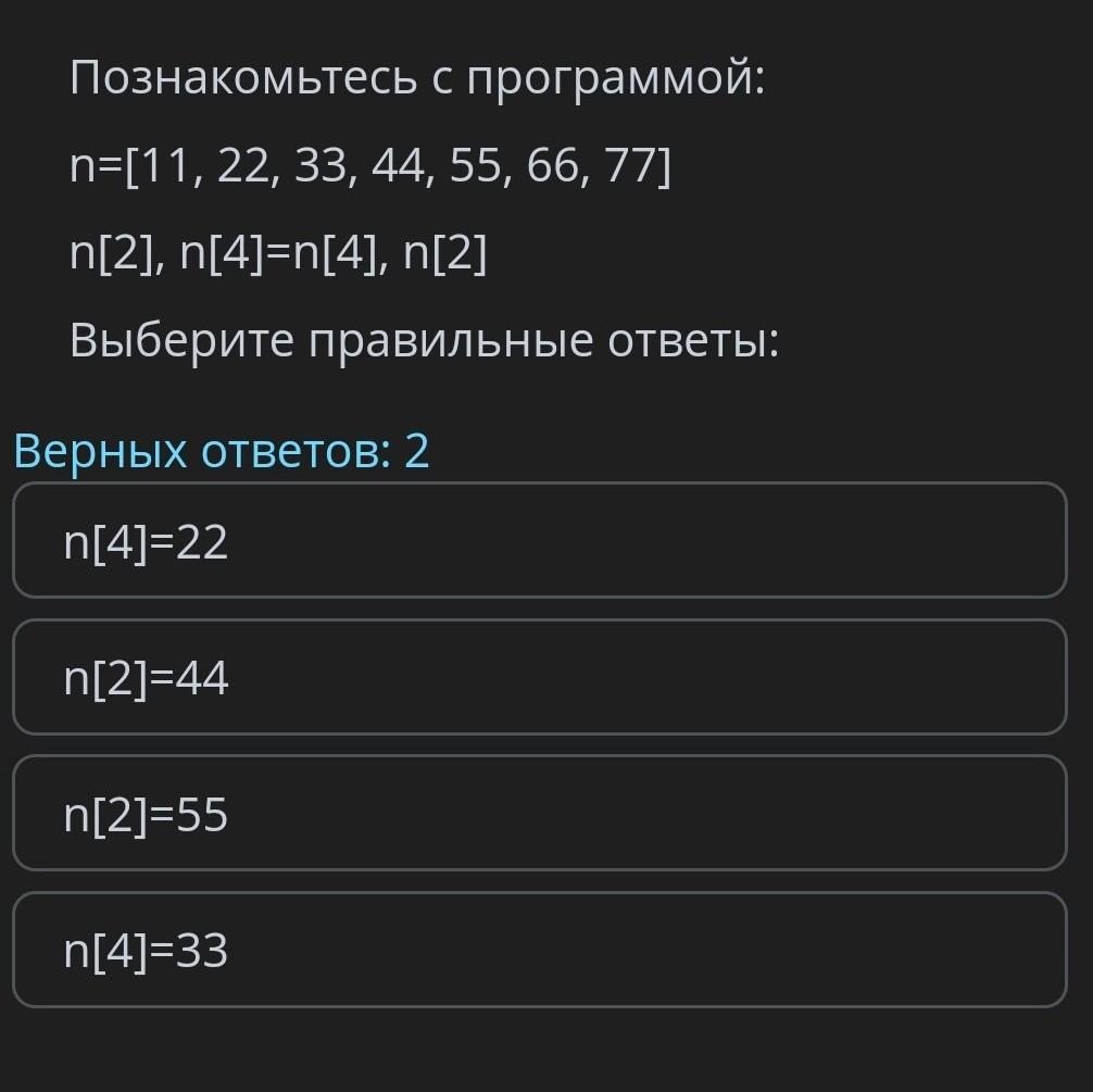 Познакомьтесь с программой: n=[11,22 33, 1, 55 , 66, 77] n[2] , n[4] = n[4], n[2] Выберите правильные ответы: Верных ответов: 2 n[4] = 22 n[2] = 44 n[2] = 55 n[4] = 33