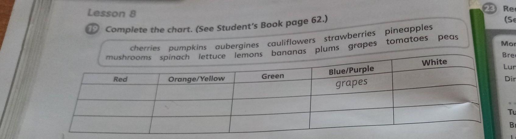 Lesson 8 19 Complete the chart. (See Student's Book page 62.) cherries pumpkins aubergines cauliflowers strawberries pineapples mushrooms spinach lettuce lemons bananas plums grapes tomatoes peas White Green Red Orange/Yellow Blue/Purple grapes