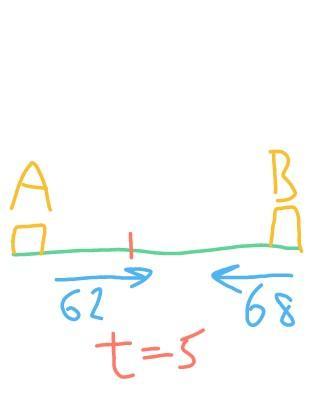 Машины едут навстречу, поэтому скорости складываются, 62+68=130км/ч