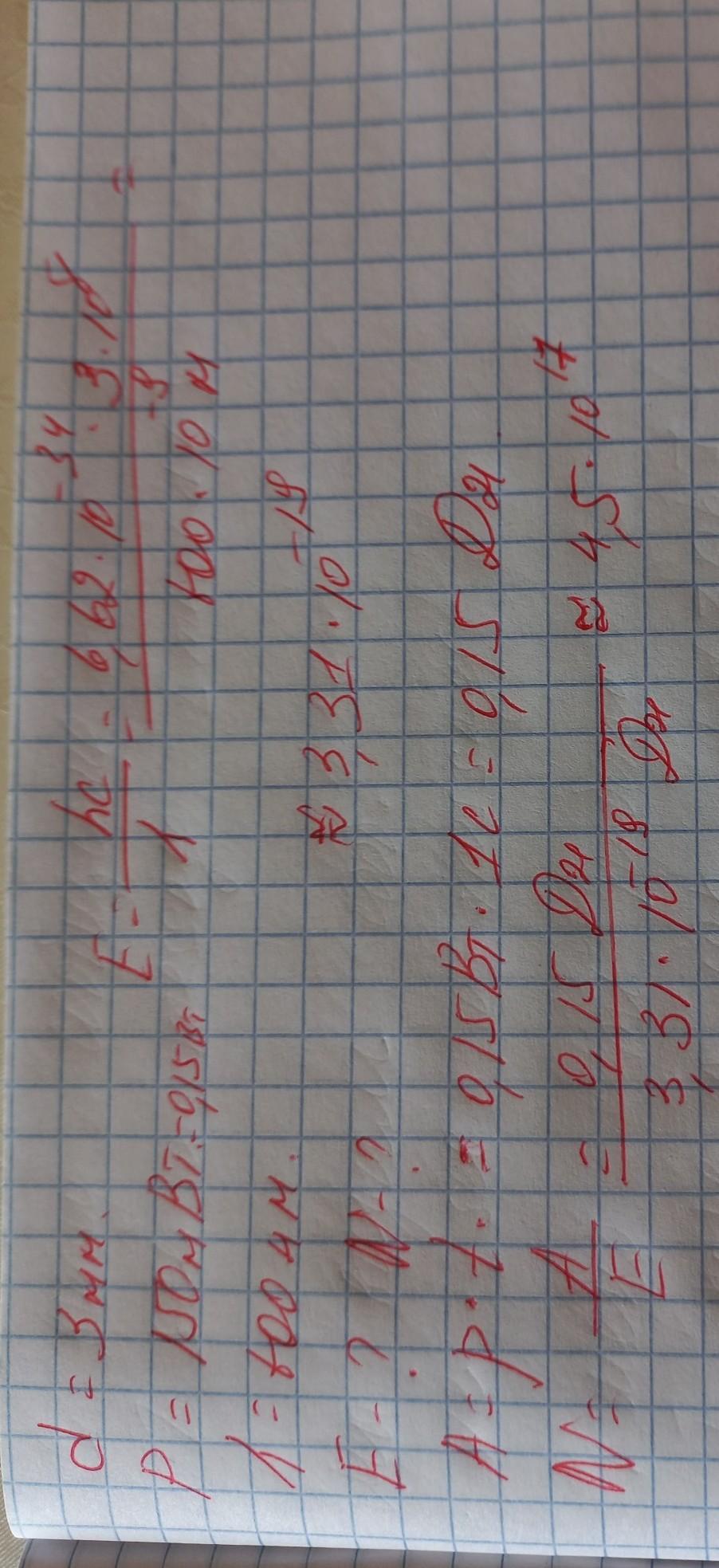 Из лазера выходит параллельный пучок света диаметром 3 мм. Мощность излучения равна 150 мВт, длина волны излучения 600нм.