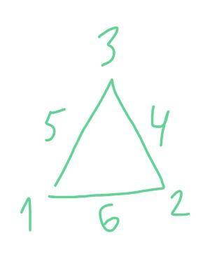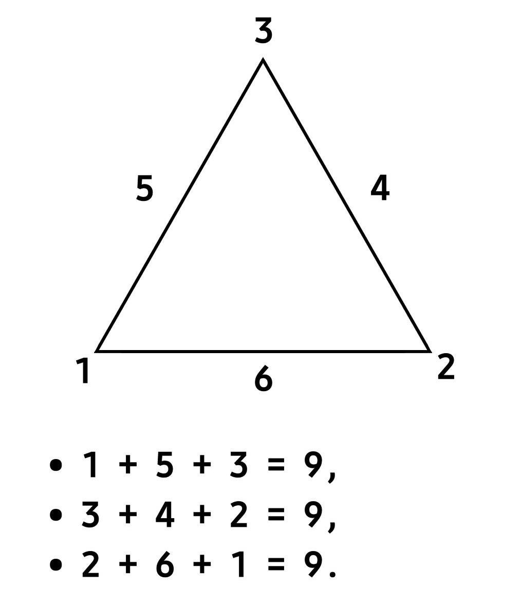 1.Расставьте в вершинах и серединах сторон треугольника числа 1, 2, 3, 4, 5, 6 так, чтобы сумма трёх чисел, стоящих на каждой из сторон, была одна и та же