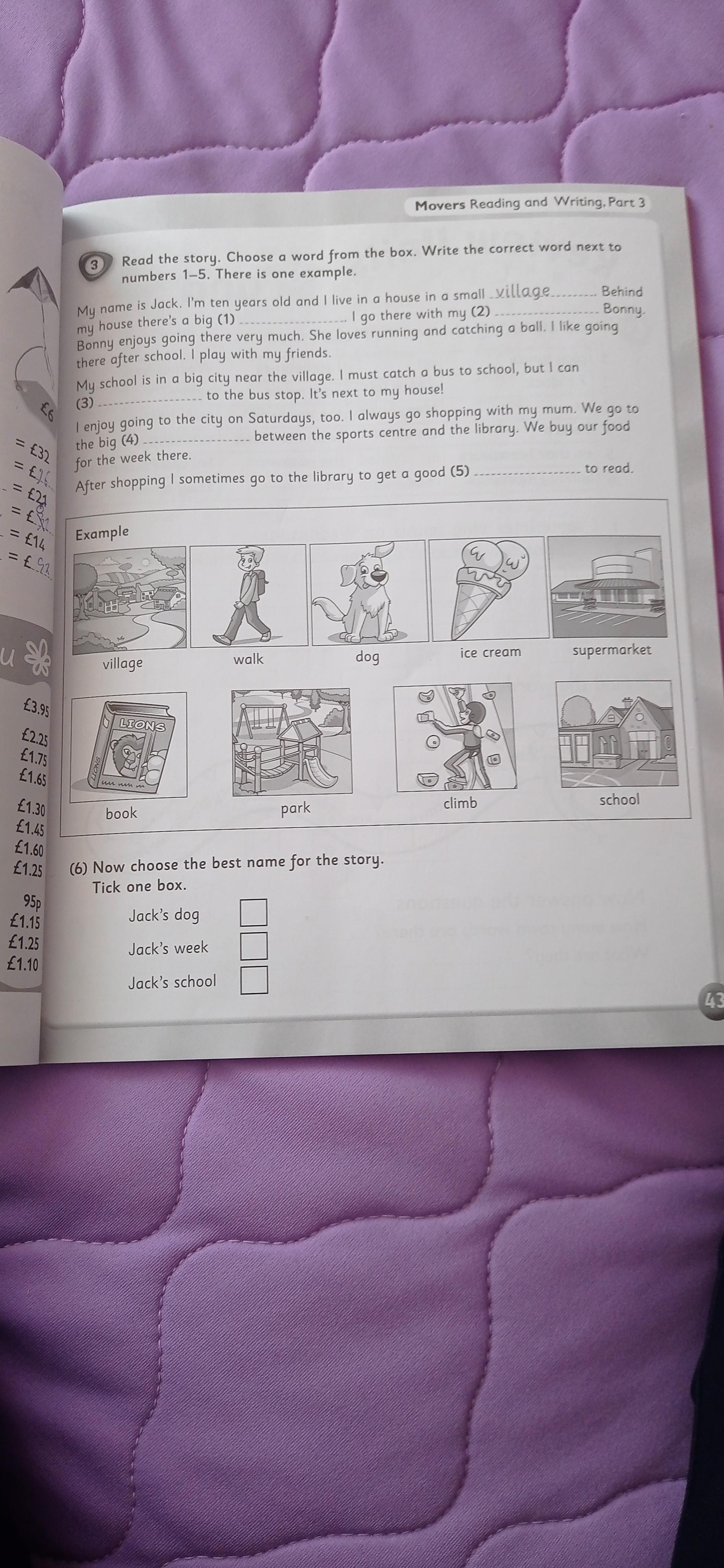 1) supermarket 2) dog 3) climb 4) park 5) book