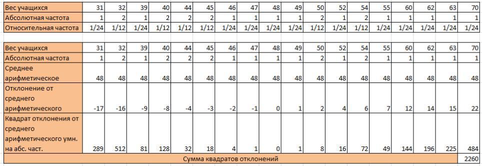 Чтобы вычислить дисперсию, нужно найти сумму квадратов отклонений от среднего арифметического и разделить на объем выборки.