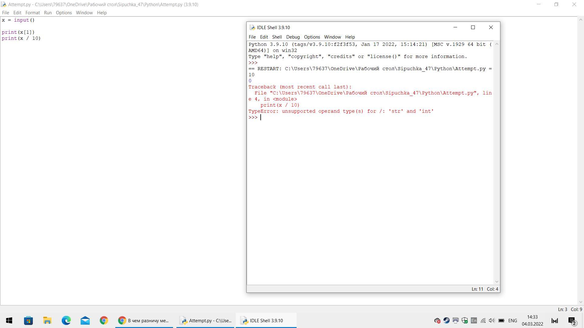 При записи x = input() тип данных - str, с ним нельзя делать операции деления и умножения, но можно узнать длину строки при помощи функции len(x) или обратится к символу строки к примеру x[0] (эта команда выведет первый символ строки).