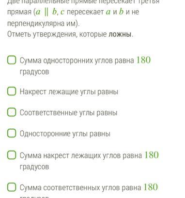 Ложные утверждения: Односторонние углы равны, сумма накрест лежащих углов равна 180°, сумма соответственных углов равна 180°