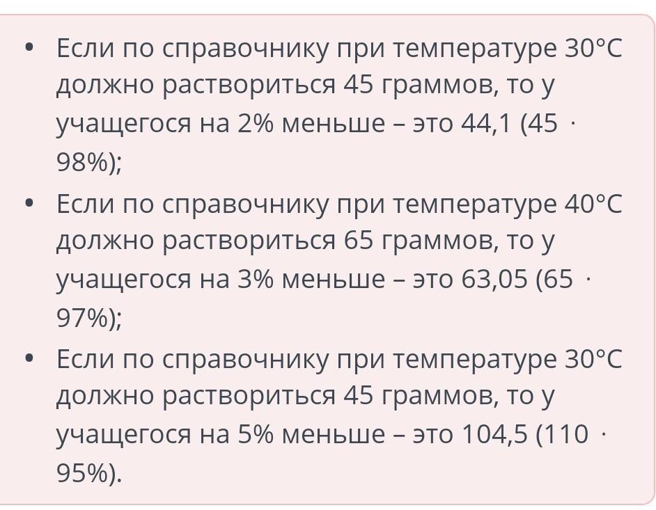 Диана исследовала растворимость нитрата калия при температуре 30, 40 и 60ºС. Она сравнила свои результаты со справочными данными и рассчитала, что ее результат при 30°C на 2% меньше, при 40°C – на 3% меньше, при 60°C – на 5% меньше, чем данные справочника.
